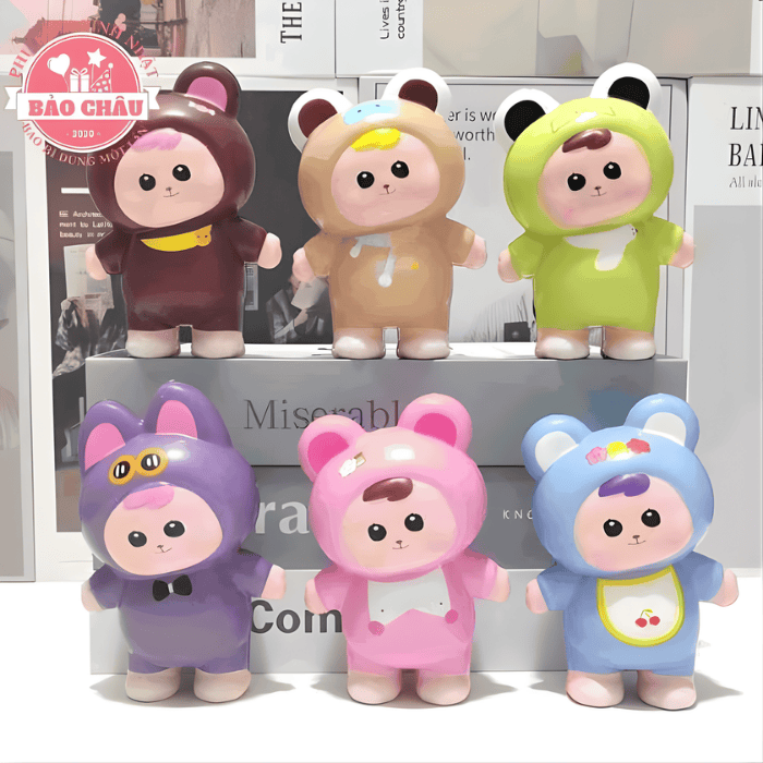 - Tượng Gấu, Thỏ, Mèo: Đây là bộ ba “quốc dân” không bao giờ lỗi mốt. Tượng gấu ôm trái tim tượng trưng cho sự ấm áp, thỏ trắng tinh khôi đại diện cho sự ngây thơ, và mèo con đáng yêu phù hợp với mọi lứa tuổi. Các mẫu tượng này thường được thiết kế với chất liệu silicon mềm mại, nhiều màu sắc và tư thế (ngồi, đứng, ôm đồ vật) để dễ dàng phối hợp.
